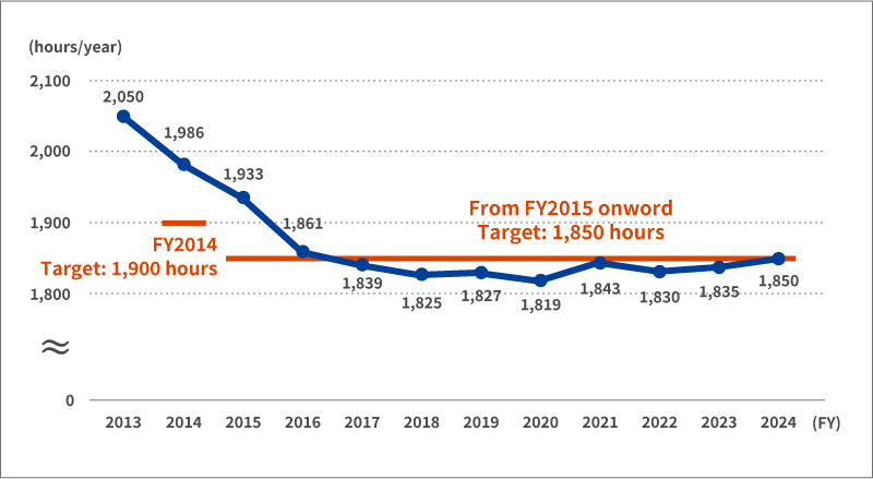 In the area of facilitating diverse working styles, we are working to reduce overtime and improve long working hours, with the goal of employees working an average of 1850 total hours of work per year (for 26 companies in the Oji Group Head Office area).