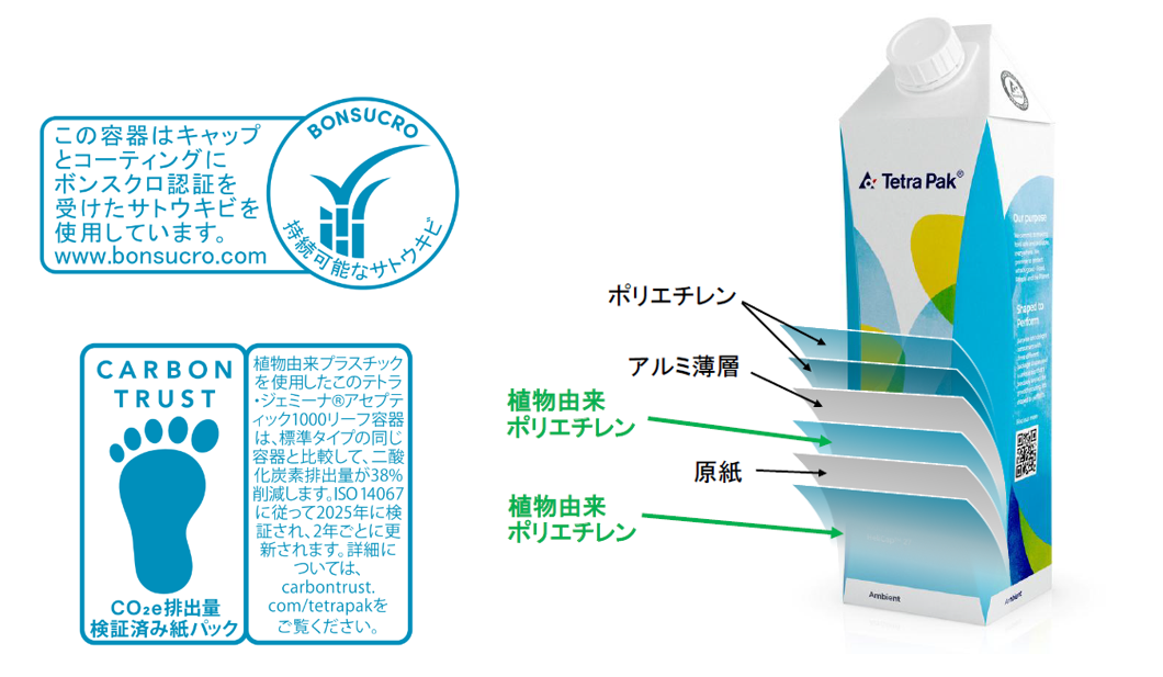 このCO₂削減率はCarbon Trust認証を取得しており、該当容器にはCarbon Trust認証ラベルが印刷され、視覚的にCO₂削減を訴求できるようになります(*2)。さらに、植物由来のポリエチレンはBonsucro認証(*3)を取得しており、サトウキビの持続可能な生産を支援しています。なお、日本テトラパックが国内で販売するアルミ付き紙容器(大型:500ml以上) において、植物由来ポリエチレンを採用するのは初めてです(*4)。